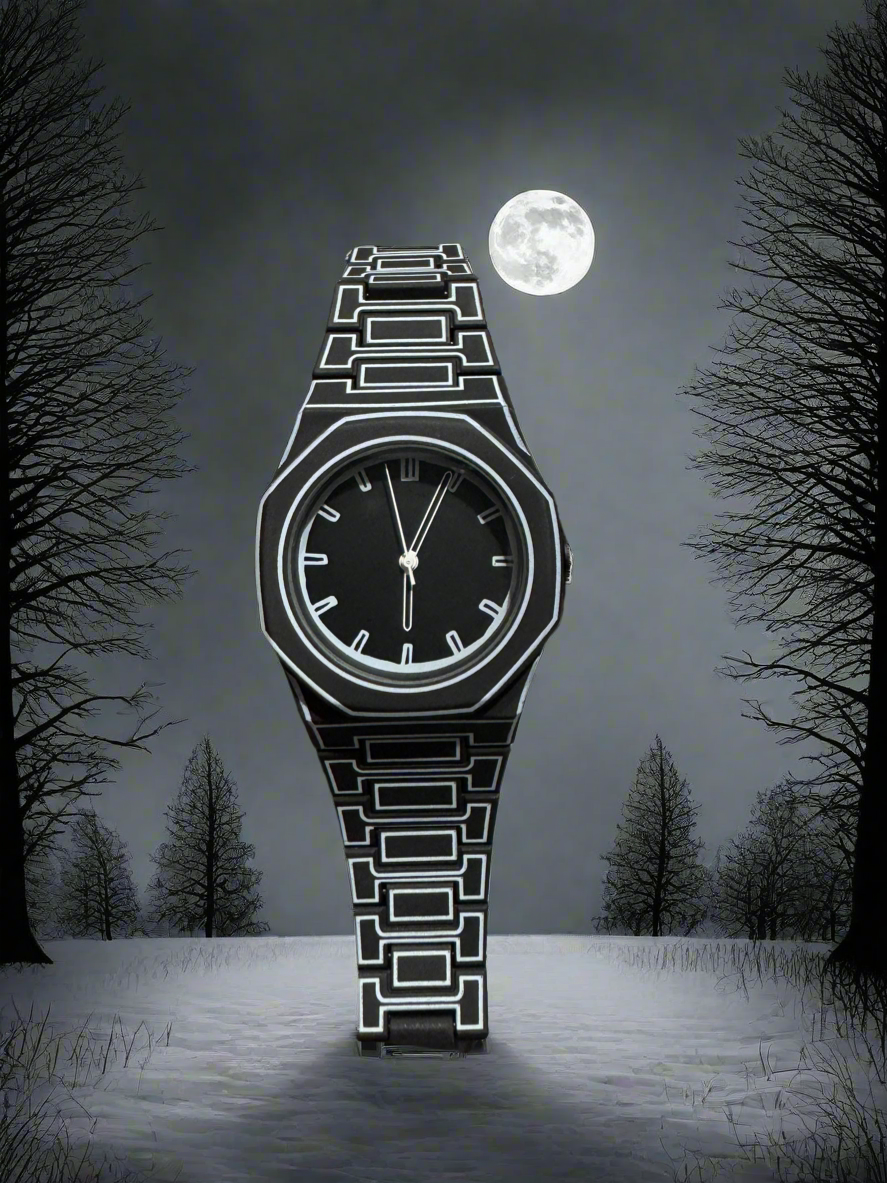 When the sun sets, the world changes-and Nightfall rises. Crafted for those who thrive in darkness, this watch merges sleek design with a quiet intensity. Every detail reflects the mystery and power of the night, reminding you that true strength often comes when others sleep. From late-night sessions to city streets after dark, Nightfall is your constant companion in a world that never rests.