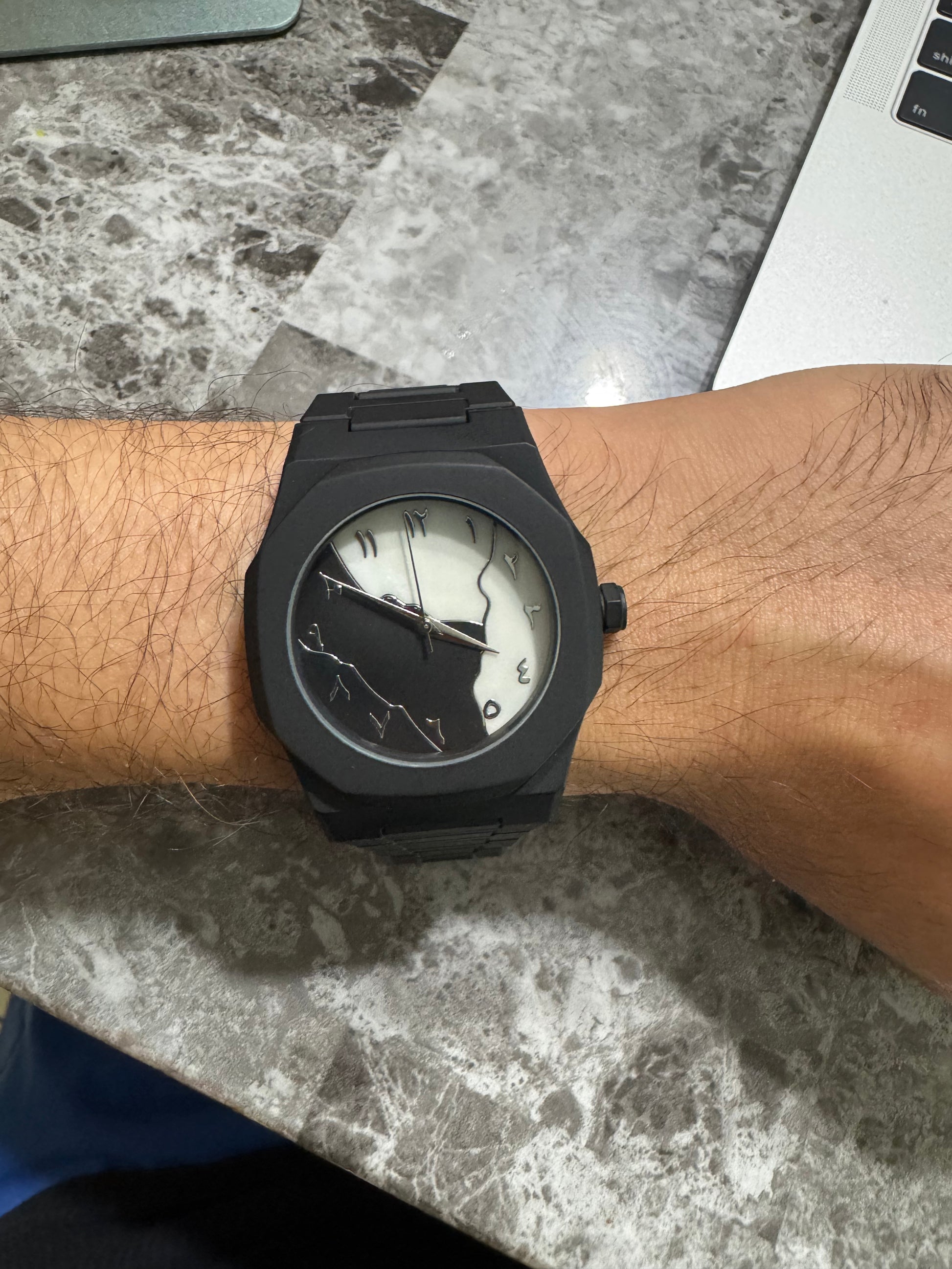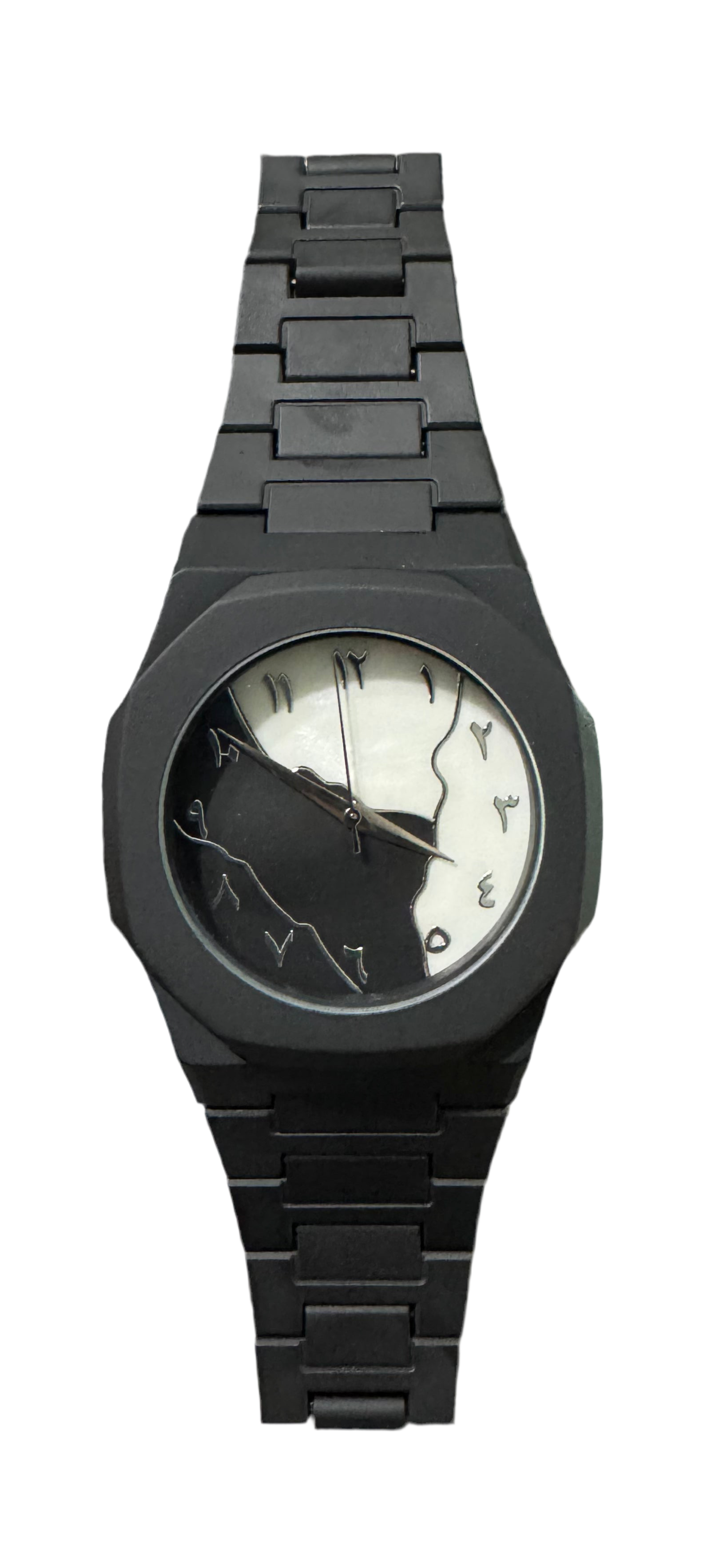 - Sleek black dial with flowing dual-tone design.